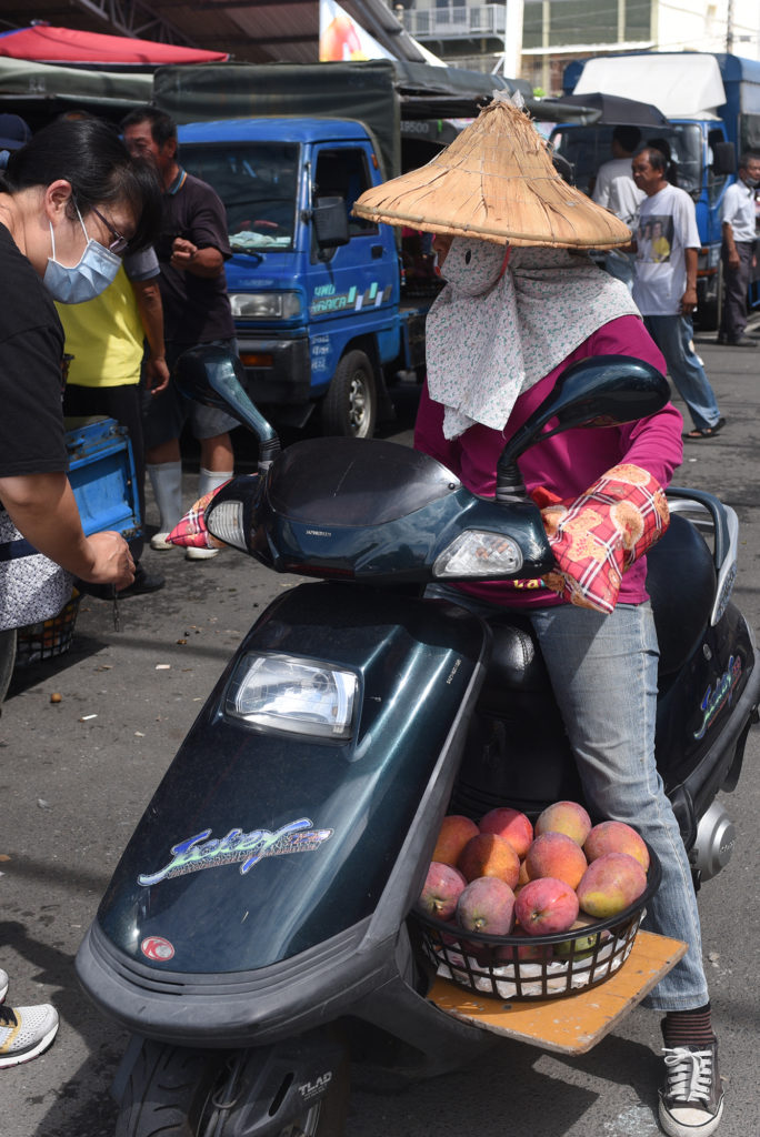 商売の環境としては、最も過酷といっていいだろう。私が取材をしていた午前10時から正午までの間、青空が広がり、気温は30度を上回っていた。青果市場は大屋根が日差しを遮り、ミストの噴射もあるので、暑さはしのげる。トラックの荷台にマンゴーを並べて売る人たちは、幌の陰に逃れることができる。バイクの移動販売の人たちはというと、帽子や笠をかぶって頑張ることになる。「マンゴーのふるさと」で生きる人たちのガッツを感じさせられる風景である。