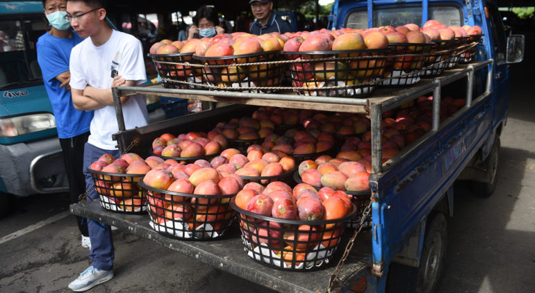 【トップ画像の説明】マンゴーフェスの会場に運び込まれるマンゴー=2023年7月1日、台南市玉井区の青果市場