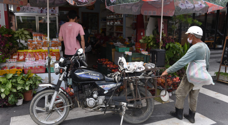 【トップ画像の説明】店先にバイクを停める。店内ではマンゴーやドライマンゴーが売られている=2023年7月1日、台南市玉井区の青果市場