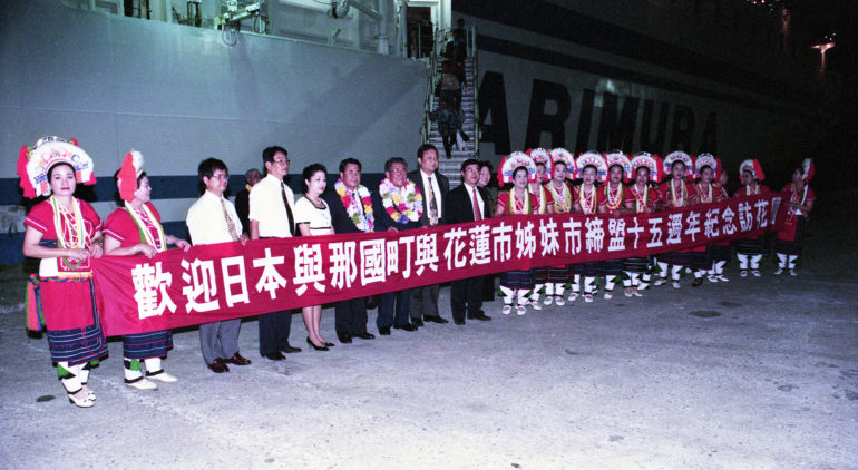 台湾と与那国は近い。与那国町と花蓮市との間では1982年に姉妹都市の盟約が結ばれている。この写真は、15周年の1997年に与那国町の一行が花蓮で歓迎を受けたときの様子である。